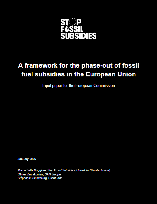 A new policy paper, A framework for the phase-out of fossil fuel subsidies in the European Union, by Stop Fossil Subsidies, ClientEarth and CAN Europe, sets out how the European Union can finally phase out fossil fuel subsidies through binding law, ahead of the Commission’s planned Q4 2026 revision of the Climate and Energy Governance framework.